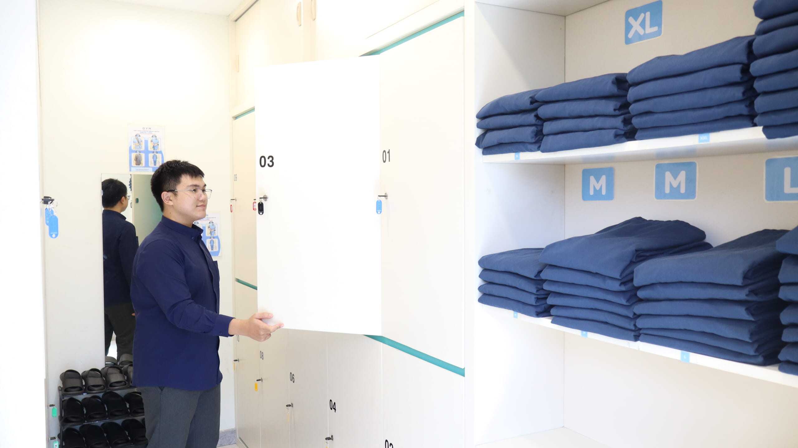 更衣室にて健診着にお着替えください。健診着はS、M、L、XL、XXL、XXXLサイズをご用意しております。また、靴はロッカーに入れ、スリッパに履き替えてください。